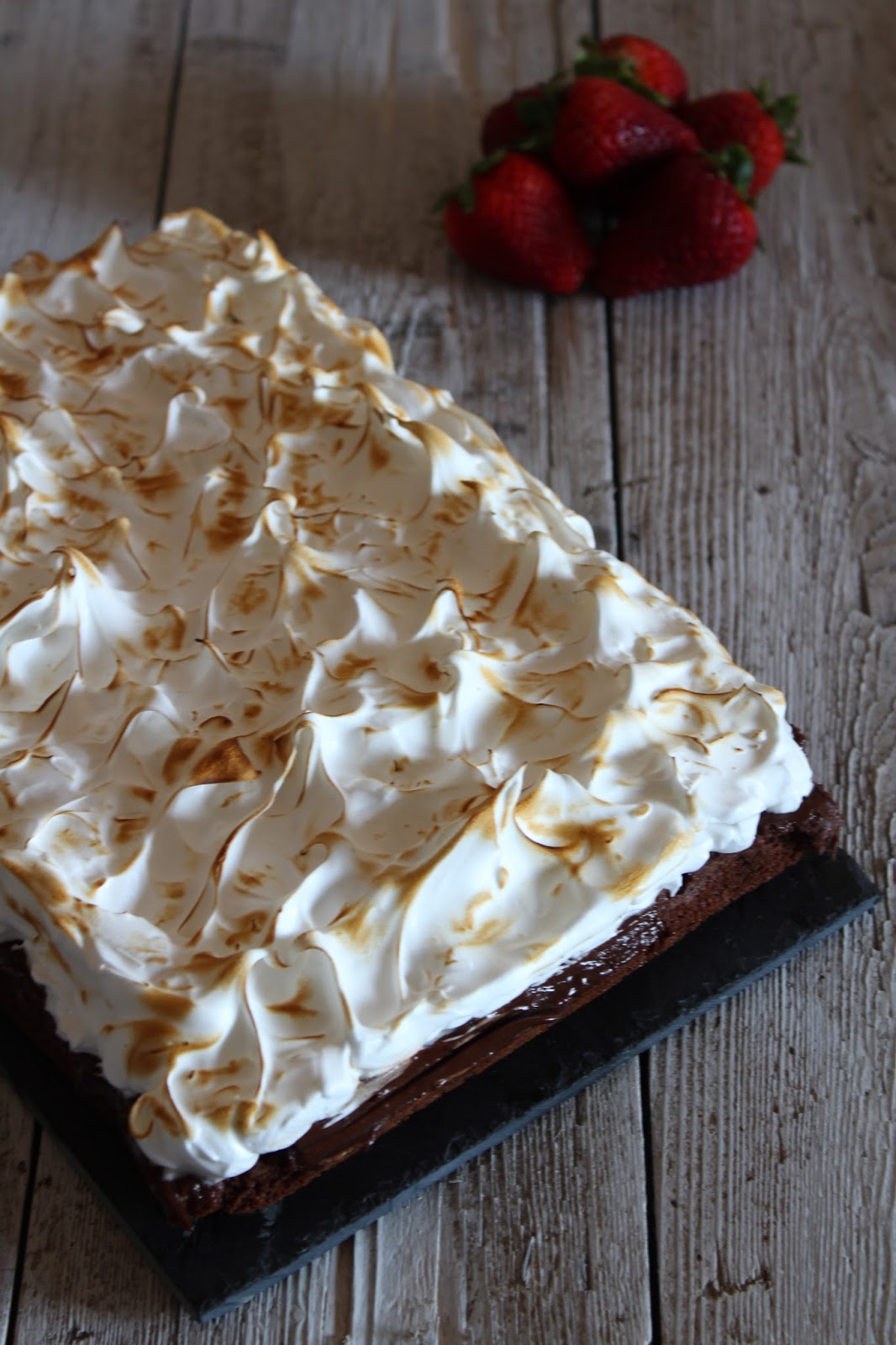 Com a espátula, espalhe o merengue por cima do brownie, faça uns picos e queime com um maçarico de cozinha.